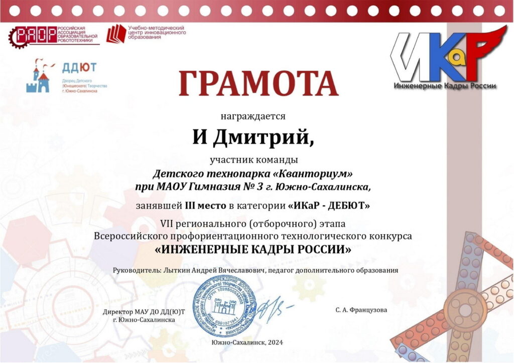 По итогам VII регионального (отборочного) этап Всероссийского профориентационного технологического конкурса “Инженерные кадры России” в номинации “ИКаР-ДЕБЮТ”, наша команда заняла 3 место.