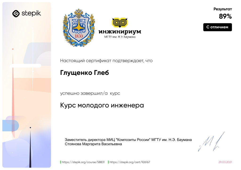 Курс молодого инженера 2021 Учащиеся06.06.202112.06.2021 hitech В этом году семеро учащихся квантума Хайтек «Базовый модуль 2021» прошли дополнительно «Курс молодого инженера» от МГТУ им Н.Э.Баумана на платформе stepik.org и получили сертификаты с отличием. Метки2021Курсы