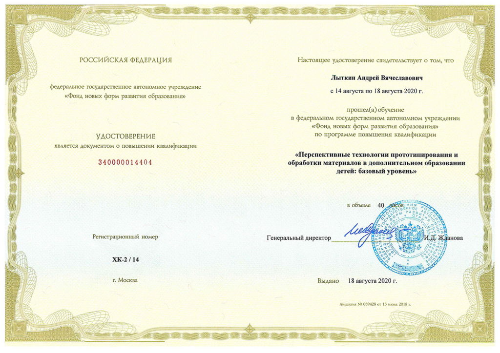 18 августа 2020 пройдено обучение по программе “Перспективные технологии прототипирования и обработки материалов в дополнительном образовании детей: базовый уровень” в федеральном государственном автономном учреждении “Фонд новых форм развития образования” г. Москва.