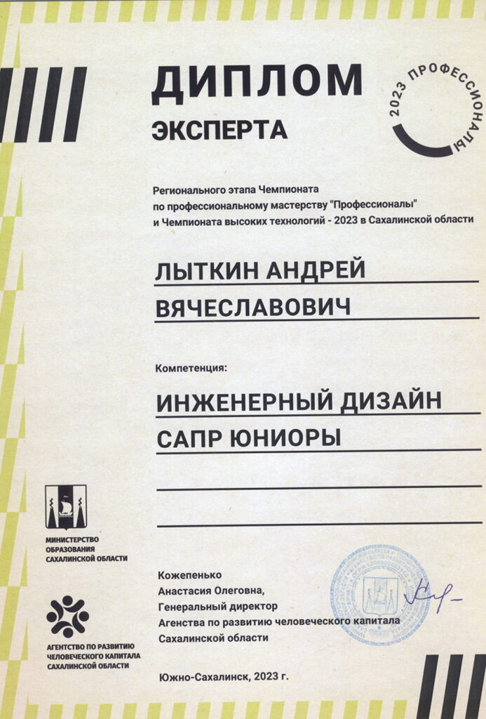 Принял участие в качестве эксперта в Региональном этапе Чемпионата по профессиональному мастерству “Профессионалы” Сахалинской области и Чемпионата высоких технологий – 2023, по компетенции «Инженерный дизайн САПР».
